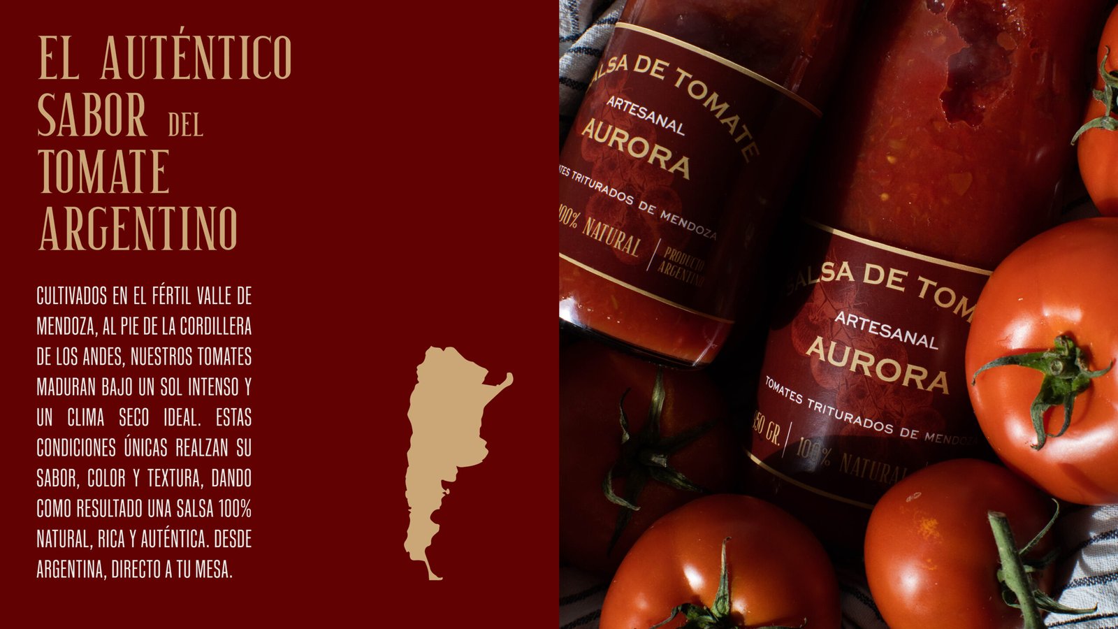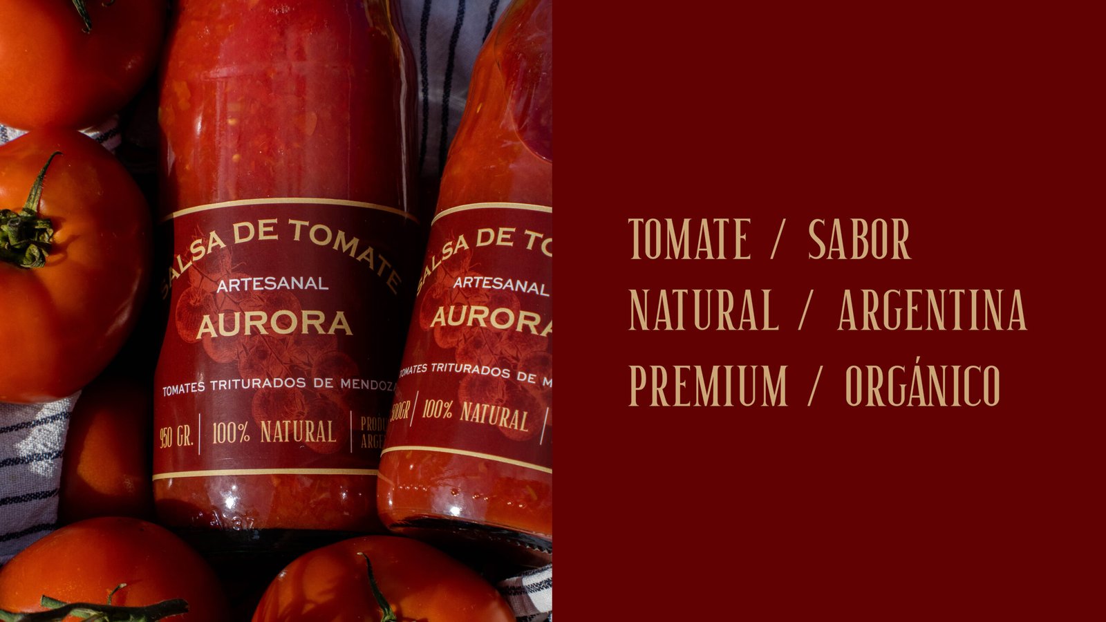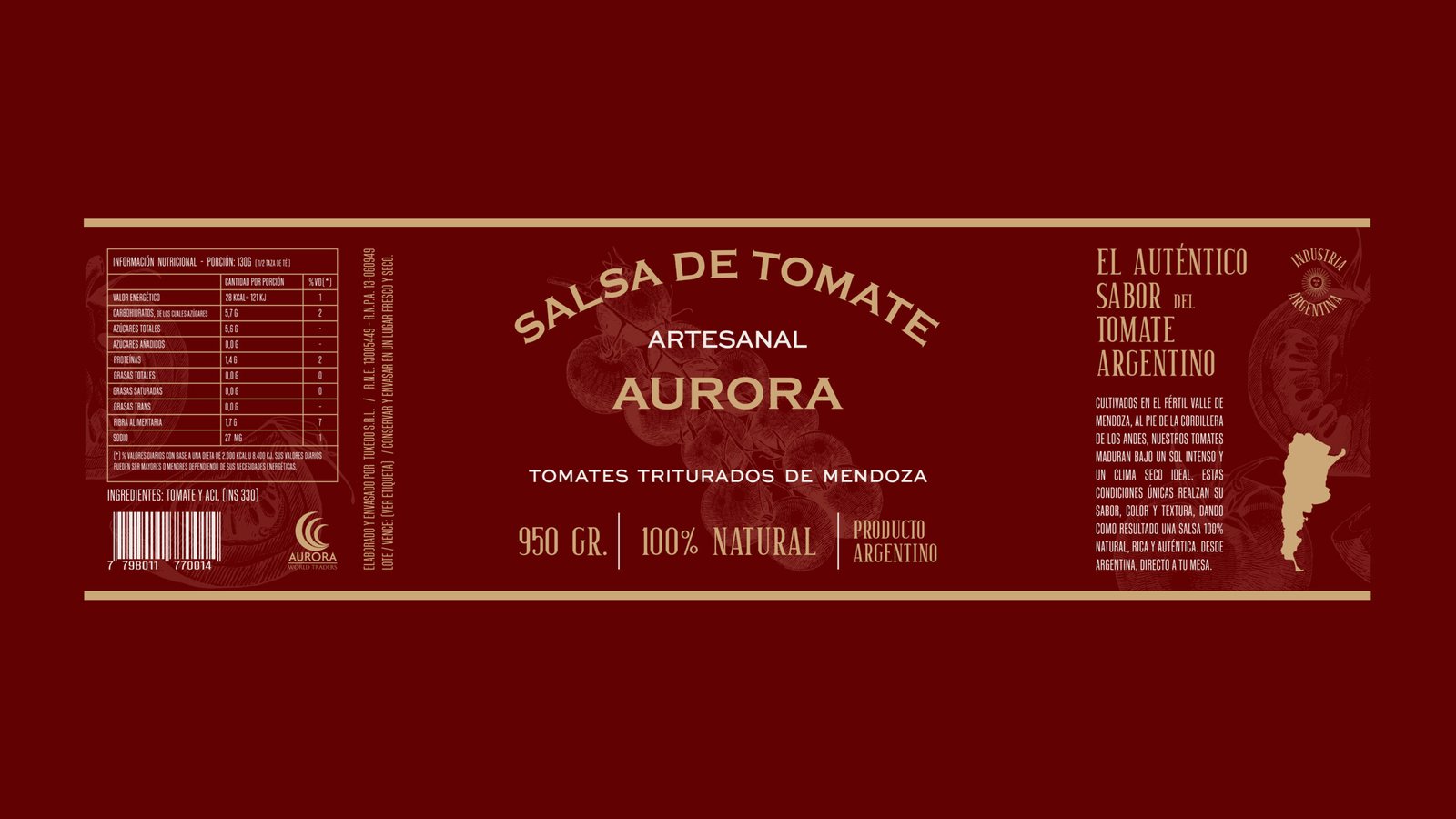 Diseño de Packaging para Aurora, una marca argentina de salsa de tomate. Originalmente conocida como Tuxedo, esta salsa proviene de Mendoza, una región cercana a Los Andes argentinos. Sabor, calidad y naturaleza caracterizan a este producto.